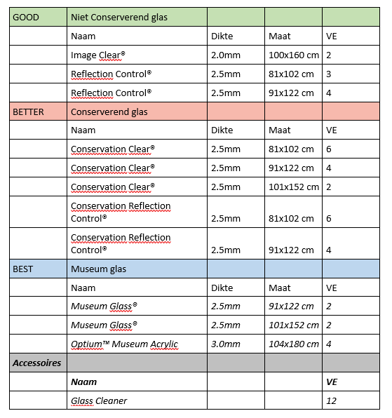 - BEST – Museum Glass® ( 98% UV werend ) is de hoogst beschikbare kwaliteit voor de inlijstingen. De combinatie van antireflectie en UV-werendheid geven een ultra beschermende bijna onzichtbare glasplaat.- Ook onder BEST valt het Optium Museum Acrylic® (98% UV werend) het enige acryl inlijstproduct met een antireflectie laag. Dus ook hier een ultra bijna onzichtbare bescherming. Het acryl is antistatisch, kraswerend, onbreekbaar en zeer licht.